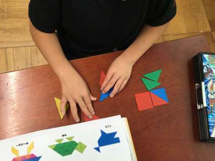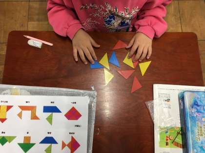 1枚1枚はおなじ三角のかたちですが,向きを変えたり組み合わせたりすると違う形ができます。