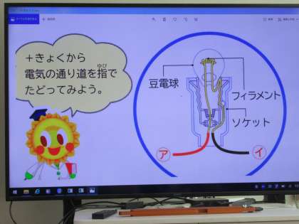 豆電球の中の仕組みを学習しました。ソケットから豆電球を外して,豆電球のどこに導線をつないだら明かりがつくか考えました。なかなか明かりがつかず悪戦苦闘していましたが,ついたときは大喜びでした。