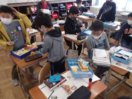 整理とは,必要な物と必要でない物に分けること。整頓とは,使いやすい物の位置を決めて仕舞うこと。子どもたちはただ漠然ときれいにするだけでなく,これから使う時のことを想像しながら学習を行いました。