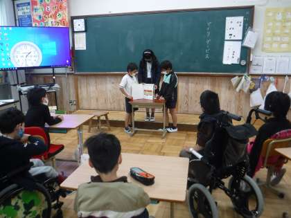 3年生が国語の学習で「班で意見をまとめよう。」という単元でどんな本を読むか話合いで決めたそうです。「マイクデービス」という本を読んでくれました。「本を読んでそらいろさんを喜ばせたい!」と来てくれました。みんなにっこり聞いていました。読書ノートに題名を書きました。