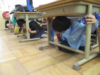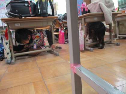みんな放送を聞くと,すばやく机の下にもぐり,避難することができました。