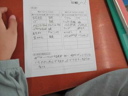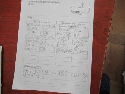 どのようなものが電気を通すのか実験しました。スチール缶・アルミ缶・ペットボトル・毛糸など。実験の結果をみんなで交流しまとめました。