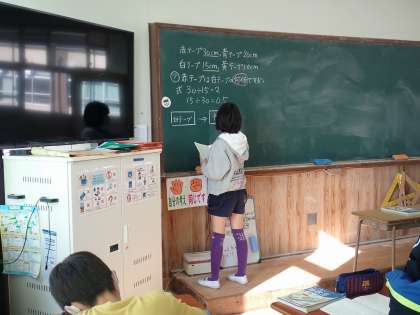 答えが分数倍になるときの式や分数倍の意味について,関係図やテープ図をかいて説明しました。正しく図に表すことができるということは,問題を正確に読み取って理解できているということです。いつでも,図に正しく表し,考えることができるように練習を重ねていきましょう。