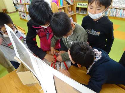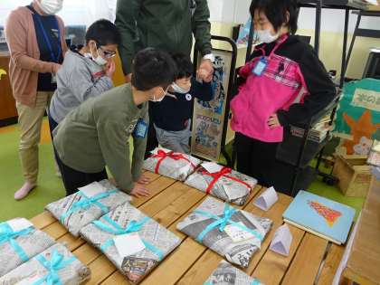 図書館で,2つの包んだ本をみんなで見て