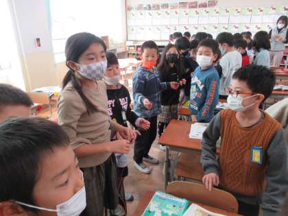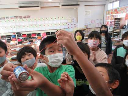みんなの導線をつないで,1つの大きな輪にして豆電球に明かりがつくかを実験しました。絡まないように,つないだところが,取れてしまわないかみんなで協力しました。見事,明かりがついたときは大歓声でした。