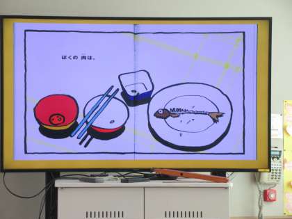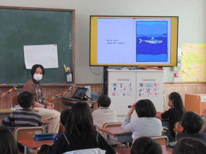 読書週間の取り組みで,1組は,坂本先生に「いわしくん」というお話を読んでいただきました。いわしくんは,自分で泳いでいたけれど,人間に食べられぼくの体の一部になって,最後はぼくと一緒に泳いでいるというお話でした。