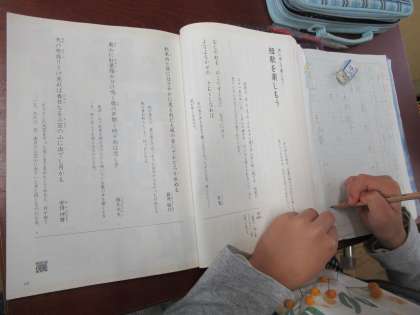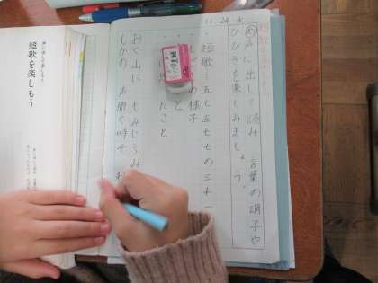 今までに俳句の学習はしましたが,短歌の学習は初めてです。五・七・五・七・七のリズムを楽しみました。そして,自分のお気に入りの短歌を一つ選び,視写しました。