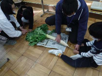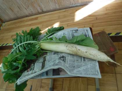 今日は,大根の長さや重さをはかりました!長さは,111センチ,重さは,2キロ200グラムでした!大きくて重たくてずっしり!おいしそうな大根です!