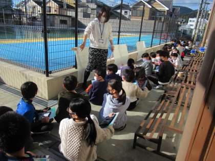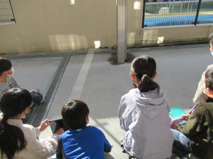鏡で跳ね返した日光は,どのように進むのかという実験をしました。子どもたちは,実験大好きです。実験の仕方を聞いて,楽しく実験しました。その後,教室で教室で実験の結果を話し合いました。