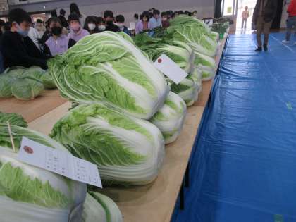 農産物品評会の担当の方のご厚意で,見学させていただきました。大きくて立派な野菜たちに驚いていました。総合的な学習で取り組んでいる「京野菜」もありました。お気に入りの野菜は「うーん,たくさんありすぎてひとつに決められない。」と言っていました。