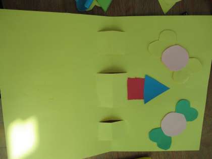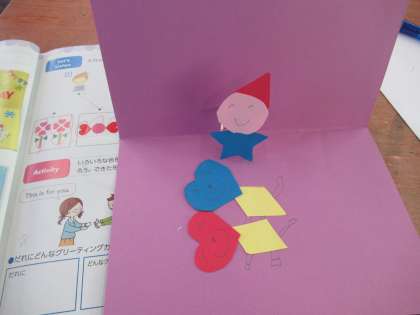 形の言い方や色の言い方を学習した後,自分たちで切ったいろいろな形のカードを組み合わせて,カードづくりをしています。クリスマスカードやお誕生日カードなど自分で選んでいます。「サンタさんにあげるの。」と。可愛いですね。