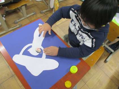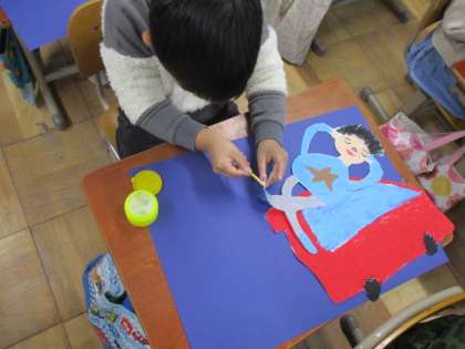 どこに何を描くかイメージしたら,乗り物に乗った自分を画用紙に貼りつけます。