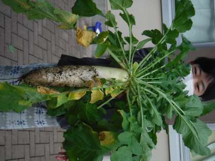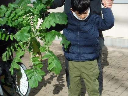 大根は,寒くなってう〜んとおいしくなりました。大きいくなった大根を嬉しそうに花束のようにもっていました。
