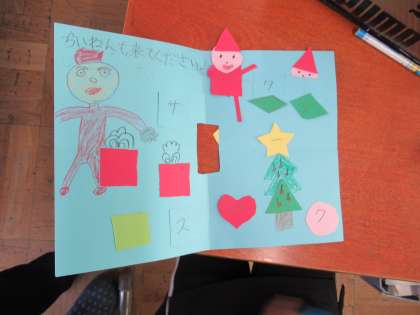 作っていたカードが完成しました。作ったカードを英語で紹介しました。何のカードを作ったのか,どんな形・何色を使ったのか発表しました。