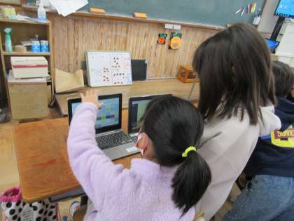 タブレットを使ってのアンケートづくりが完成しました。発表の前に2人組3人組で交流し,アドバイスを伝えあいました。