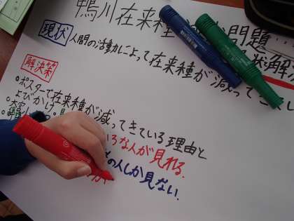 ただ「ごみを減らしましょう!」と言うだけでなく,どんな方法なら川に遊びに来た人たちがきちんとごみを持ち帰るかというアイデアを考えました。