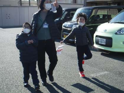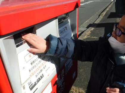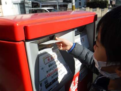 交流の先生へ書いた年賀状をポストに入れに行きました。2年生と3年生が代表でポストに入れました。