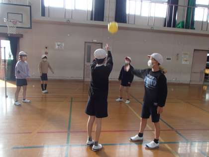 初めはオーバーハンドパスとアンダーハンドパスの練習から始めました。明後日の方向に飛んでいくボールを笑いながら追いかけて,楽しく学習が始まりました。