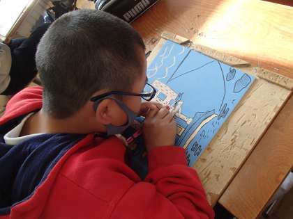 下絵を写したら早速彫り始めます。4年生の時は線彫りを行いました。5年生では,彫刻刀の特徴を生かした面彫りに挑戦しています。