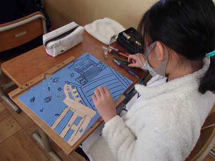彫った所はインクが付かないので白くなる,彫らずに残した部分は黒くなる。刷った時のイメージをしながら工夫を重ねて作業を進めています。