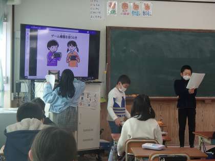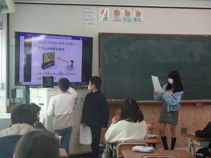 保健委員会の人が,プレゼン資料を使ってメディアとの上手な付き合い方や危険性について解説をしてくれました。お家時間が増えた人も多い3学期です。長時間テレビやゲームの画面を見ないように気をつけましょうね。