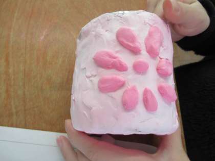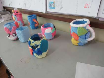 誰が使うのか,何を入れるのかを考えて作りました。ステキな容器にへんしんしました。紙粘土に色を付けるのも,粘土をこねるのも楽しかったようです。