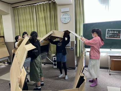 子どもたちはダンボールなどの材料を組合せながらグループごとに基地をつくっていきました。