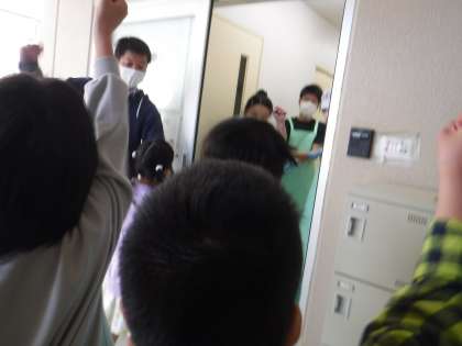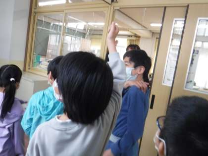 朝の会では,5年生が日直でみんなであいさつをしました。1年生は,お兄さんたちをよく見てお手本にしていました。保健室や給食室にもあいさつに行きました。