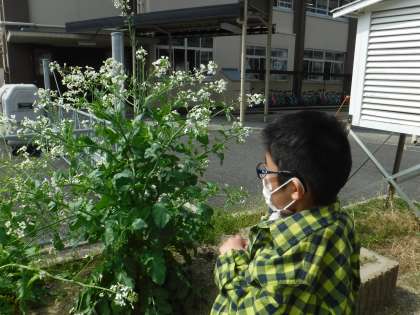 白い花が咲いています!「何の花かわかりますか?」「大根の花です。」花が咲くところまで観察したことがなかったのでみんな「わあ!すごい!」と嬉しそうです。