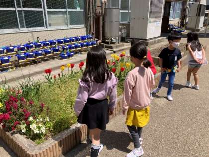 教室のお外には,1年生の花壇や,2年生の植木鉢が並んでいます。