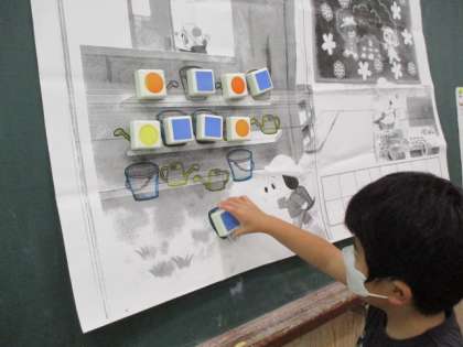 自分の教科書でしたことを,黒板の大きな絵とブロックを使って発表しました。