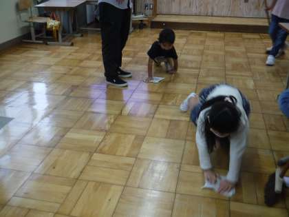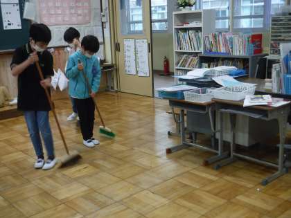 お兄さんたちがほうきではいた後,1・2年生が雑巾がけをしています。「教室がピカピカになった!」と嬉しそうな1年生。みんなで力を合わせて教室を美しくしています。