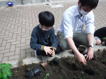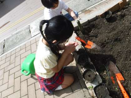 ポップコーンにするイエローポップの種をポットにまきました!1・2年生は,初めての種まきです。「大きくなあれ!」「食べたいわ。」と嬉しそうです。