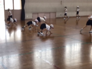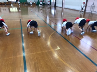 スタートは,けんけんをしたり,スキップをしたり,座った姿勢から,寝転がった姿勢から,くまになったり,あざらしになったり,かえるとびをしたりしました。