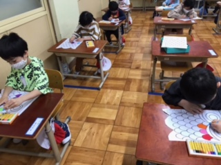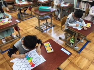 1年生 図画工作科 もうすぐ子どもの日です。今日は,クレパスを使って,こいのぼりの色ぬりをしました。一つ一つ丁寧にしっかりぬりこんでいました。色のたしざんをしていろんな色ができるのを楽しんでいました。個人懇談会の時には,教室の壁面にかわいい鯉がたくさん泳ぐことと思います。