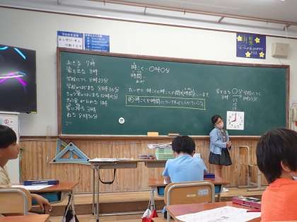 時こくと時間の学習が始まりました。時こくと時間の違いと時間の調べ方を学習しました。「長い針がどれだけ動いたかを数えたらいいよ。」前で,一生懸命説明しています。