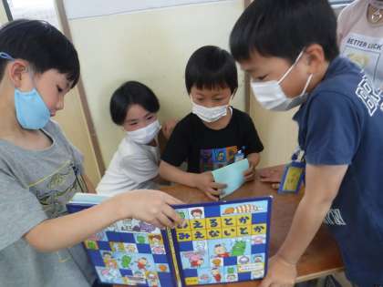 「もったいないばあさん」や「ふまんがあります」など本を読んでもらいニッコリして聞いていました。最初は緊張していましたが,優しく声をかけてもらい嬉しそうでした。「また,遊ぼうね!」と教室にもどりました。