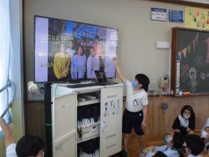 教室に1年生がやってきて迎える会が始まりました。
