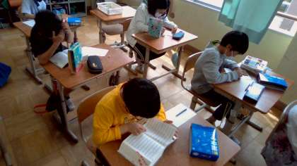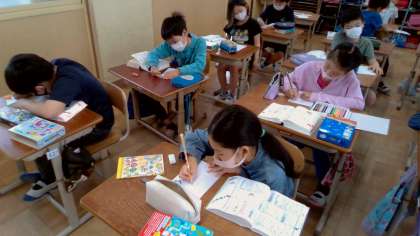 国語の学習では,漢字辞典の使い方を学習しています。この日は,漢字辞典を使わないとわからない漢字クイズを作りました。自分の名前の漢字を問題にする子どもや,お気に入りの漢字,超難問の漢字など,楽しんで問題を作っていました。