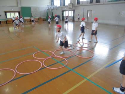 体育の学習でフラフープを使っていろいろな遊びをしました。