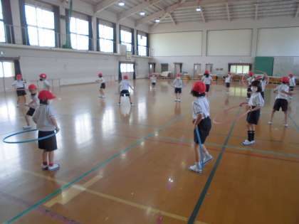 腰や腕で回す子。コマのようにクルクル回す子。なわとびのように跳ぶ子。床に並べてケンケンパをして遊ぶ子。