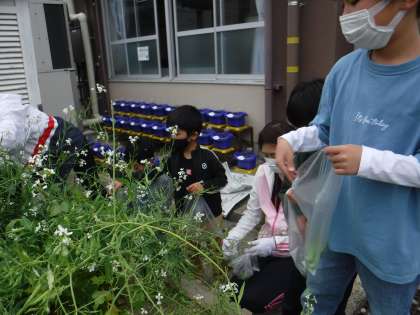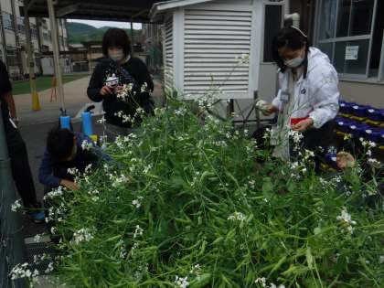 そらいろ畑の大根の収穫をしました。といっても花が咲き実がいっぱいできました。「さや大根」というそうですがいっぱい実りました。
