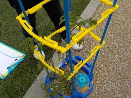 「ぐんぐんそだて おいしいやさい」の学習で育てているミニトマトが大きくなってきました。実ができてきたものもあるようです。子ども達は花が咲いていたところに実ができていることに気付いて驚いていました。
