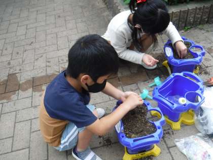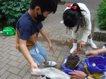 1年生は,自分の植木鉢にあさがおの種をまきました!何色の花が咲くかな?楽しみですね。
