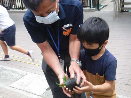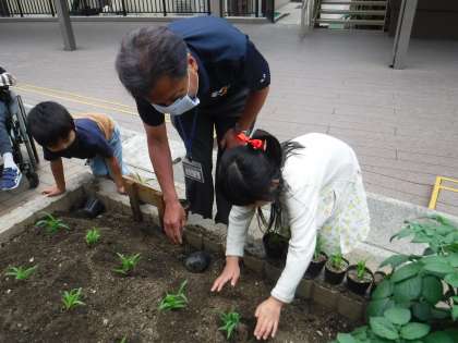 雨が降る前にイエローポップの苗の植えかえをしました。ポップコーンができるとうもろこしの種類です。たくさん実ができるといいです!