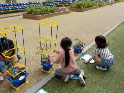 ミニトマトのなえが大きくなってきました。トマトの実の色が変わってきた人,やっと花がさいた人,ミニトマトの成長具合もそれぞれ違うようです。これからどうなっていくか楽しみですね。