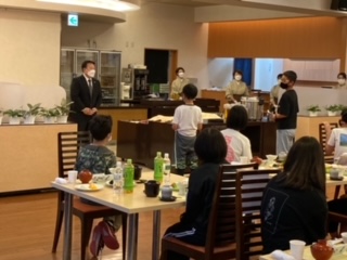 部屋に荷物を置いた後、夕食の会場で入館式を行いました。ホテルの方から温かい歓迎の言葉をいただきました。