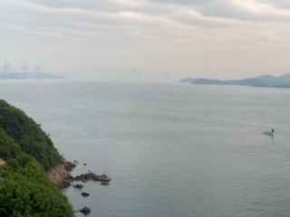 6時に起床し、着替えたり荷物の整理をしたりしています。気になる天気ですが、曇り空です。ホテルから見える瀬戸大橋も霞んでいます。これから朝食です。