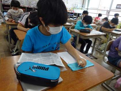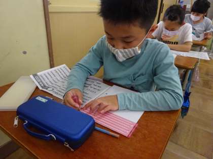 総合では,〈ともに生きる〉の学習で,点字をうつ体験をしました。