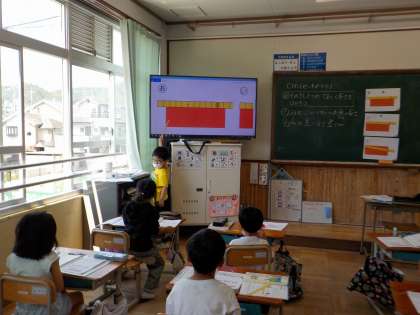長さの学習が始まりました。絵を見ながら,長さが正しく計測できているもの,できていないものについて考えました。目盛りからずれていたら正しく計測できないことをみんなで確認することができました。